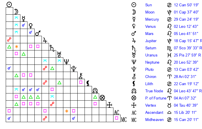 Pluto | 13 Cancer 4 | 3 Aquarius 2 | 14 Cancer 45 |