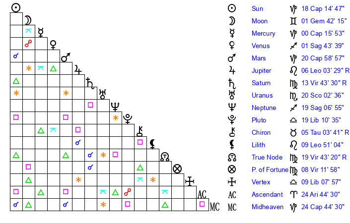 | Sun | 18 Capricorn 15 | 19 Capricorn 6 | 4 Pisces 54 |