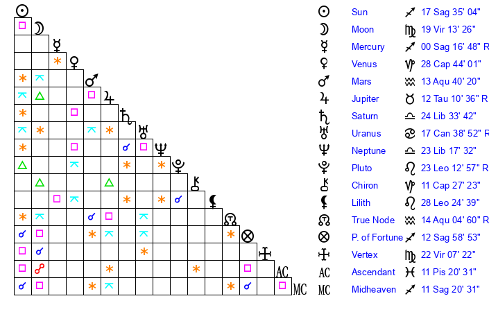 | Sun | 17 Sagittarius 35 | 17 Sagittarius 52 | 1 Pisces 46 |