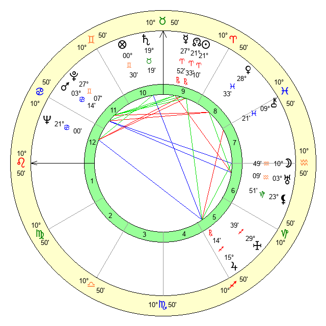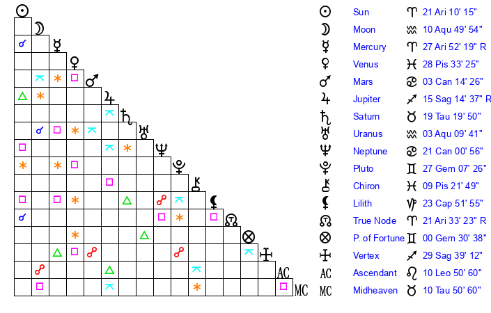 | Sun | 21 Aries 10 | 21 Aries 48 | 9 Leo 44 |