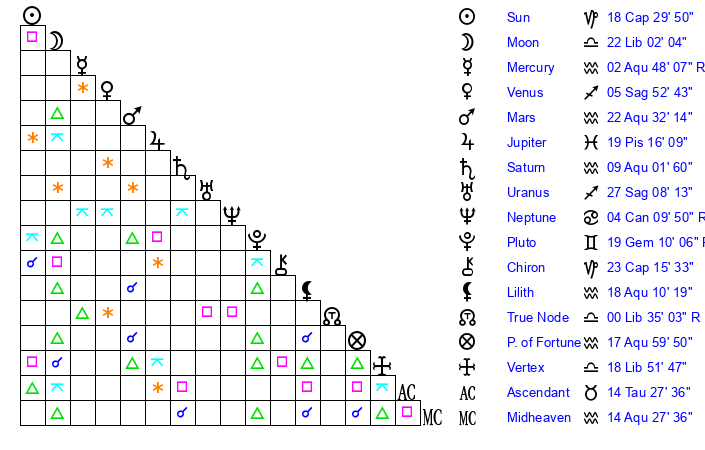 | Sun | 18 Capricorn 30 | 20 Capricorn 9 | 19 Taurus 3 |