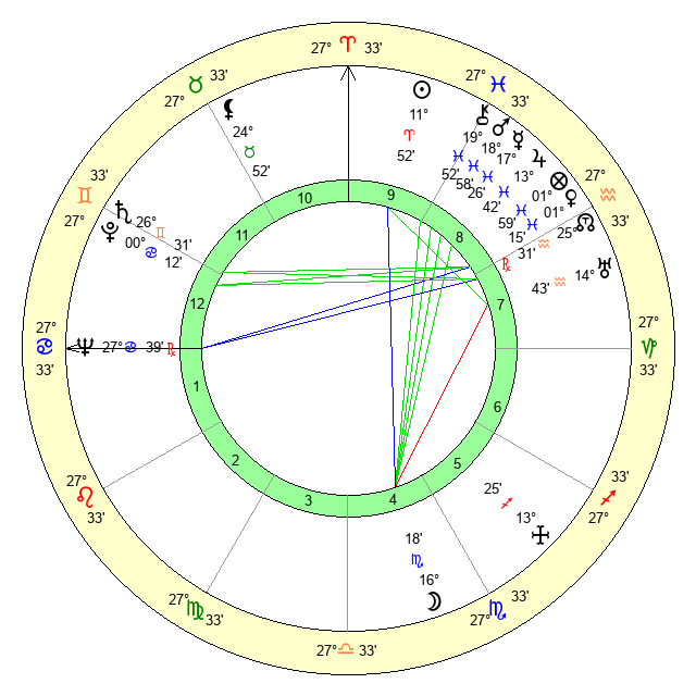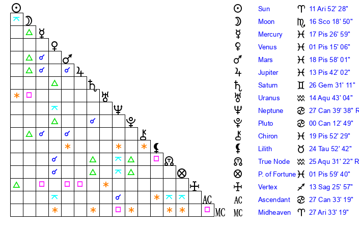 | Sun | 11 Aries 52 | 13 Aries 12 | 27 Cancer 49 |