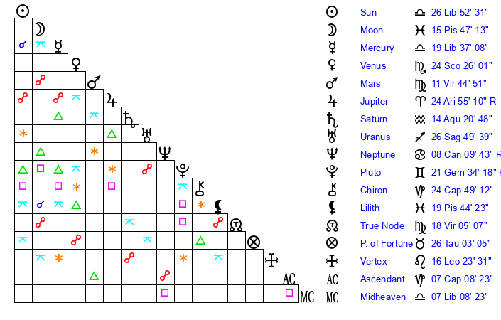 | Sun | 26 Libra 53 | 27 Libra 33 | 29 Aquarius 24 |