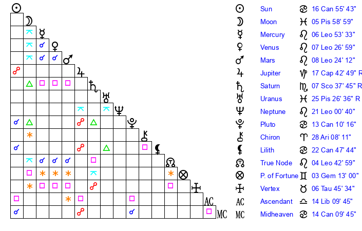 | Pluto | 13 Cancer 11 | 2 Aquarius 56 | 14 Cancer 45 |