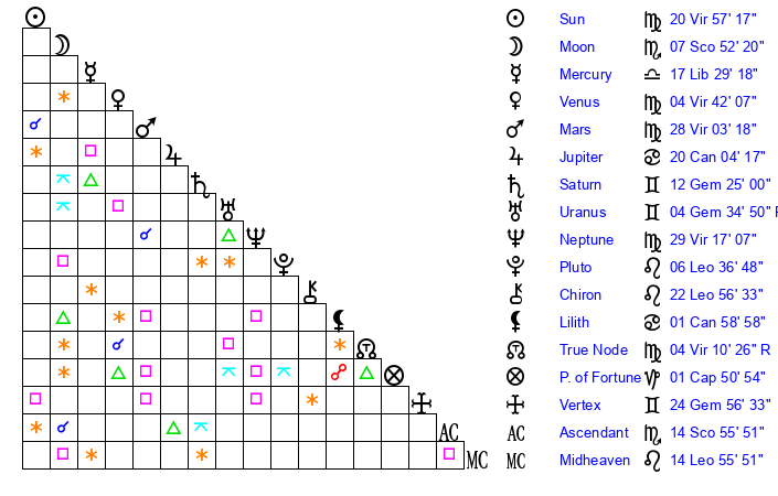 Moon | 7 Scorpio 51 | 21 Gemini 25 | 20 Scorpio 20 |