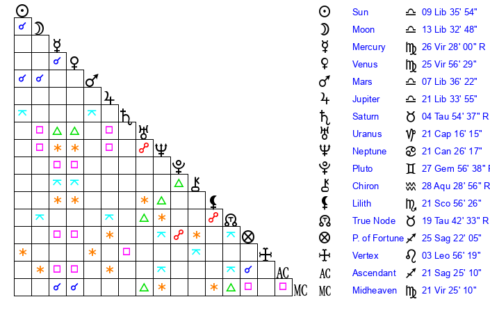| Moon | 13 Libra 29 | 24 Aquarius 48 | 23 Sagittarius 40 |