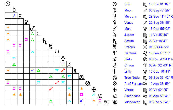 | Sun | 19 Scorpio 1 | 19 Scorpio 33 | 5 Pisces 34 |