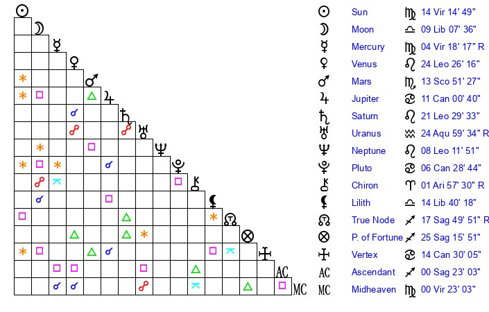 | Sun | 14 Virgo 14 | 15 Virgo 19 | 1 Capricorn 4 |
