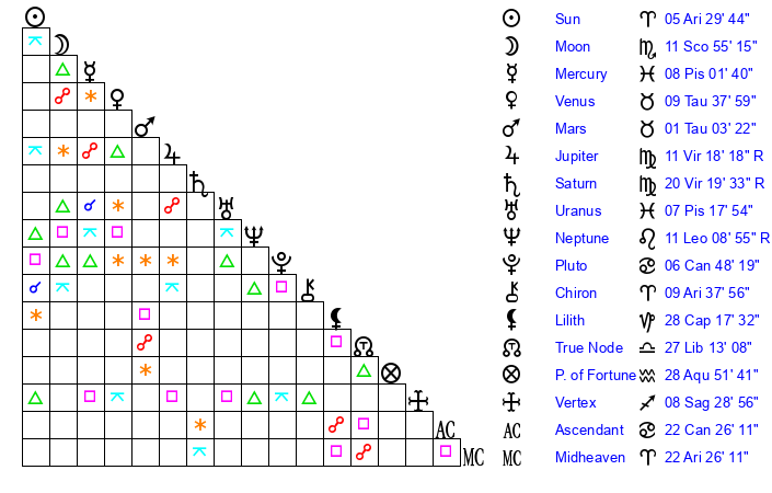 | Saturn | 21 Virgo 5 | 23 Pisces 46 | 20 Virgo 34 |