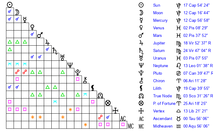 | Saturn | 25 Virgo 29 | 15 Pisces 5 | 19 Virgo 23 |