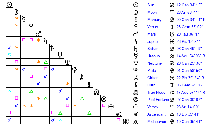 | Sun | 12 Cancer 34 | 13 Cancer 55 | 29 Libra 12 |