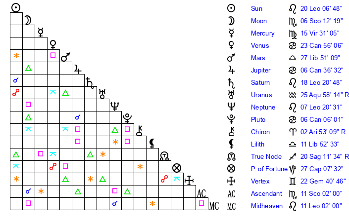 | Neptune | 7 Leo 21 | 1 Aries 45 | 9 Leo 15 |
