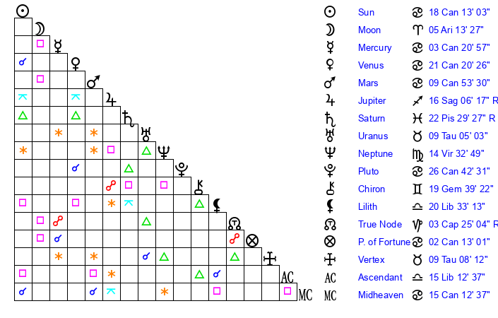 | Pluto | 26 Cancer 42 | 2 Aquarius 55 | 28 Cancer 39 |