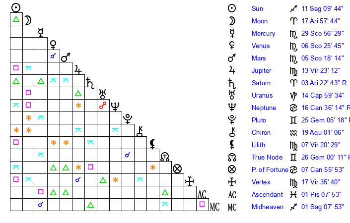 | Sun | 11 Sagittarius 10 | 11 Sagittarius 47 | 9 Aries 21 |