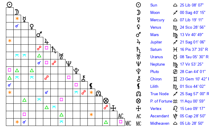 | Sun | 25 Libra 8 | 25 Libra 34 | 25 Capricorn 9 |
