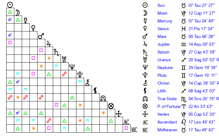 | Moon | 12 Capricorn 1 | 21 Taurus 28 | 18 Cancer 39 |