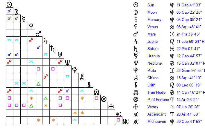 | Moon | 5 Capricorn 21 | 27 Aquarius 25 | 23 Aries 27 |
