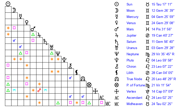 | Moon | 12 Gemini 23 | 10 Virgo 57 | 14 Gemini 50 |