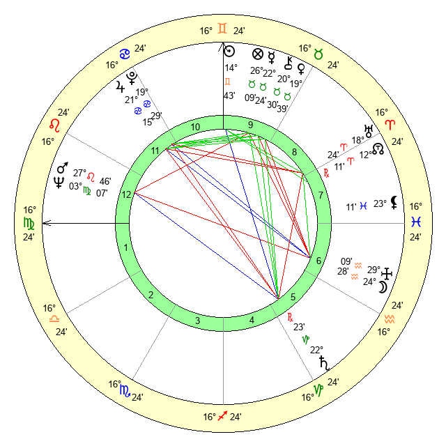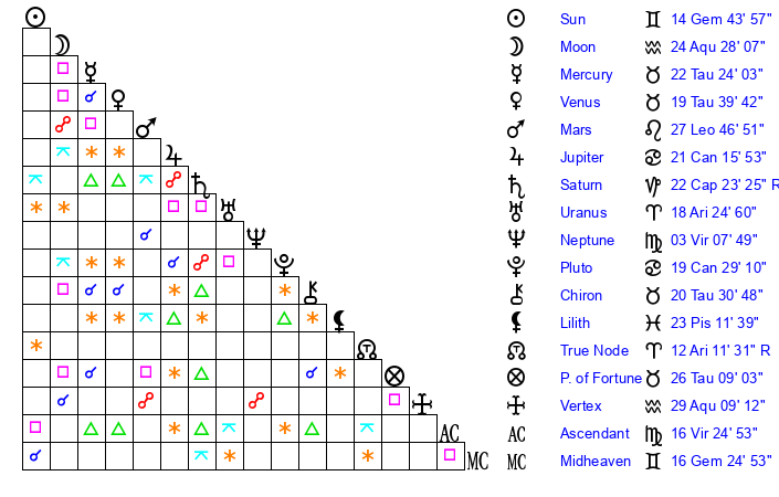 | Sun | 14 Gemini 44 | 15 Gemini 57 | 14 Virgo 47 |