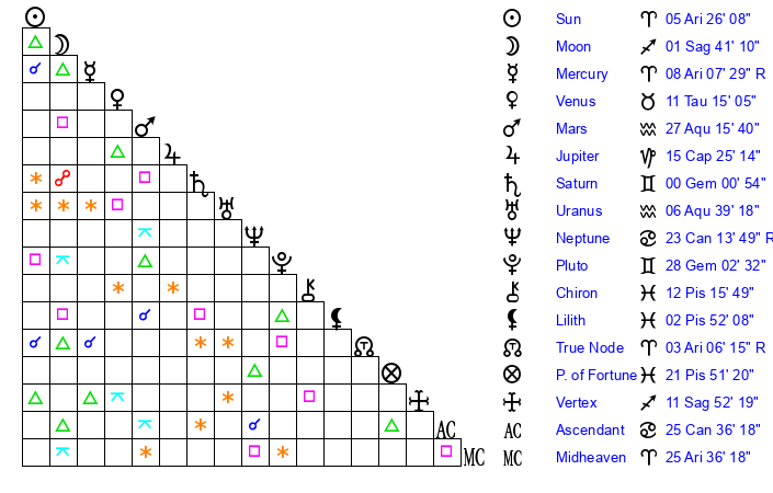 | Sun | 5 Aries 26 | 6 Aries 17 | 23 Cancer 31 |