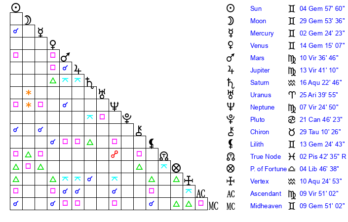 | Sun | 4 Gemini 58 | 5 Gemini 42 | 2 Virgo 59 |
