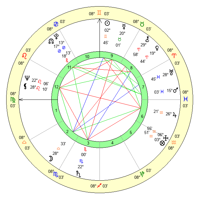 | Sun | 2 Gemini 45 | 3 Gemini 46 | 7 Virgo 31 |