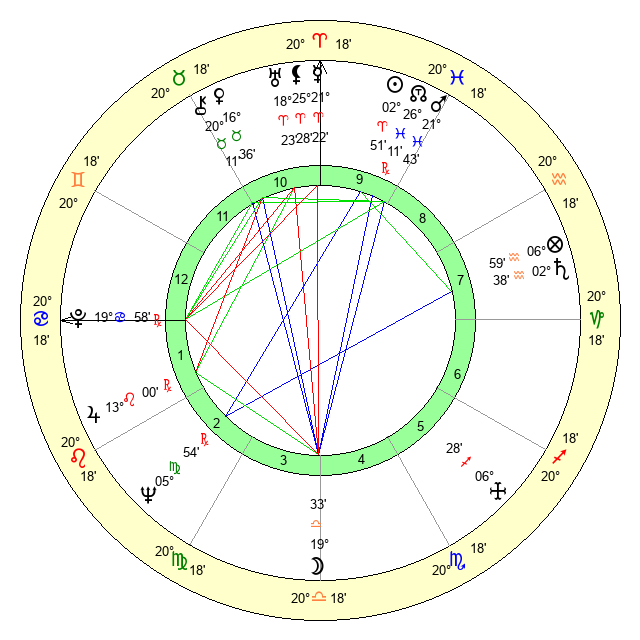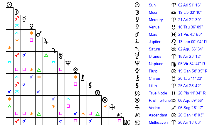 | Sun | 2 Aries 51 | 3 Aries 19 | 2 Cancer 56 |