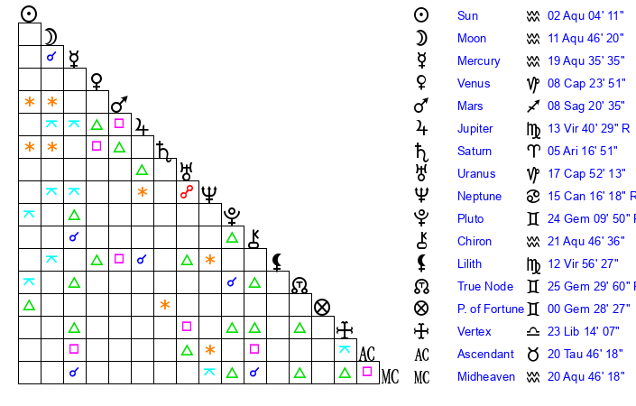 | Moon | 11 Aquarius 42 | 12 Scorpio 2 | 15 Taurus 30 |