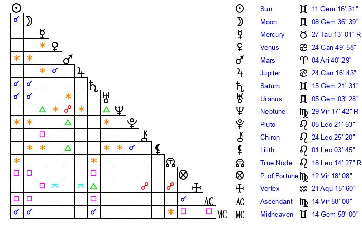 | Moon | 8 Gemini 28 | 7 Virgo 26 | 11 Gemini 49 |