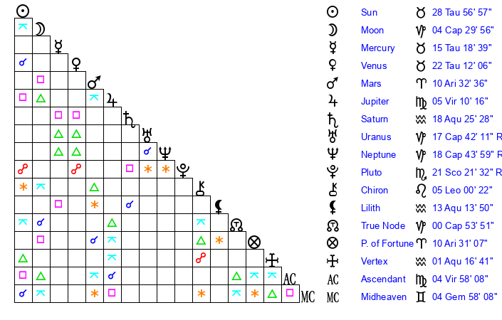 | Moon | 4 Capricorn 23 | 19 Aquarius 5 | 12 Pisces 13 |