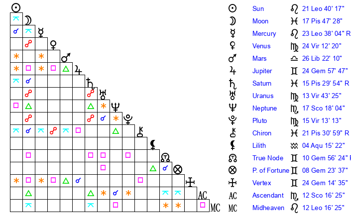 | Mercury | 23 Leo 38 | 4 Leo 55 | 1 Scorpio 19 |