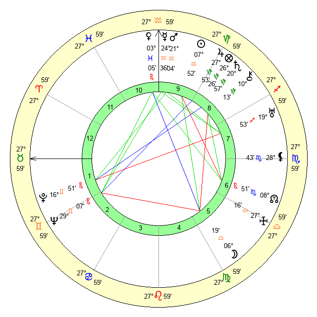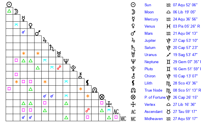 | Moon | 6 Libra 19 | 28 Capricorn 29 | 23 Pisces 54 |