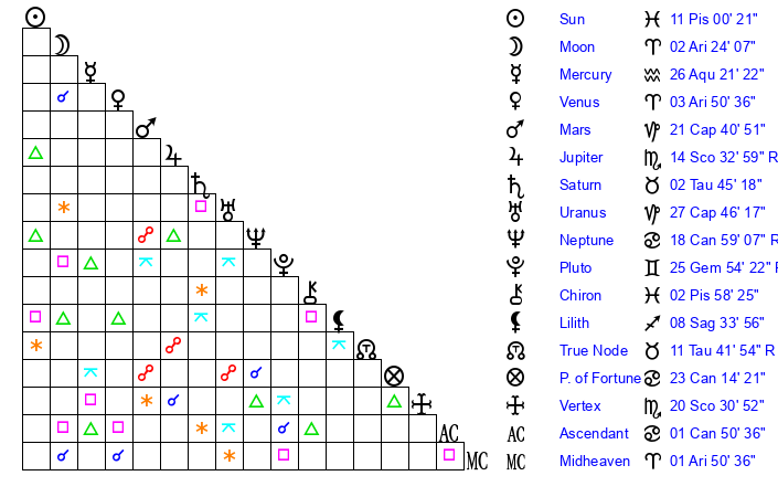 | Sun | 11 Pisces 0 | 12 Pisces 22 | 2 Cancer 3 |