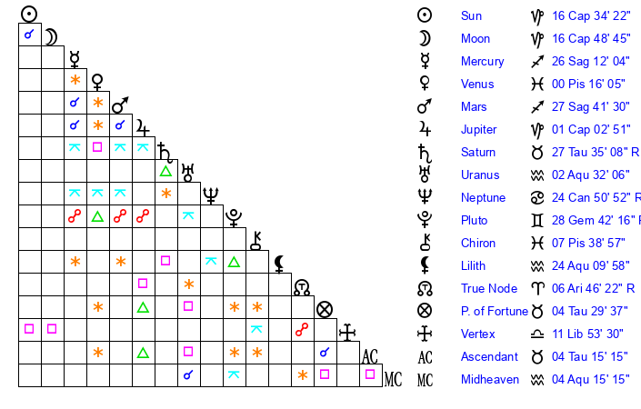 | Sun | 16 Capricorn 34 | 17 Capricorn 9 | 9 Taurus 29 |