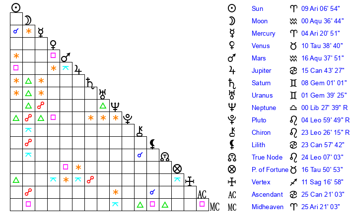 | Moon | 0 Aquarius 42 | 27 Aries 55 | 3 Aquarius 16 |