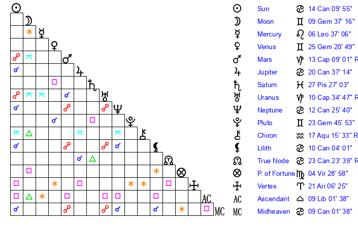 | Moon | 9 Gemini 35 | 6 Sagittarius 27 | 25 Virgo 15 |