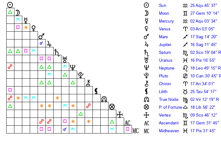 | Sun | 25 Aquarius 45 | 27 Aquarius 16 | 5 Gemini 8 |