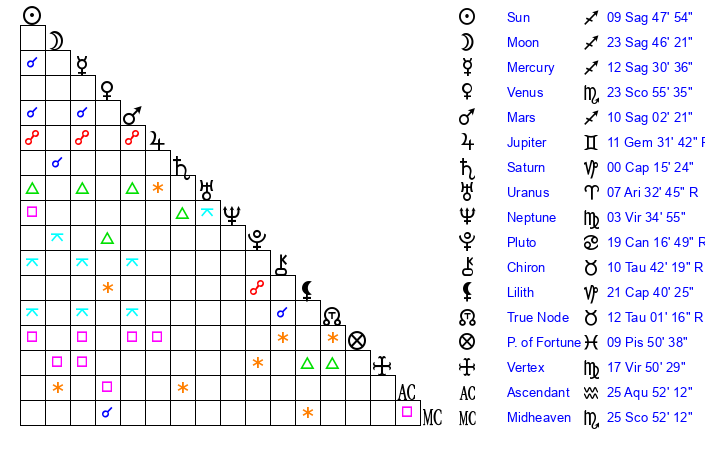 | Moon | 23 Sagittarius 44 | 24 Sagittarius 39 | 7 Gemini 14 |