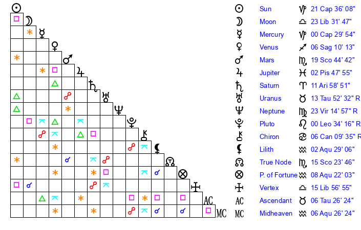 | Sun | 21 Capricorn 36 | 22 Capricorn 30 | 18 Aries 56 |