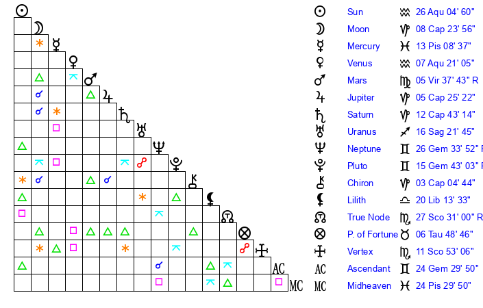 | Pluto | 15 Gemini 43 | 2 Aquarius 30 | 17 Gemini 26 |