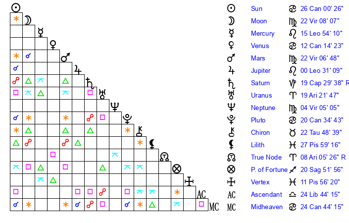 | Moon | 22 Virgo 7 | 18 Taurus 56 | 4 Pisces 18 |