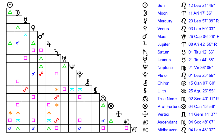 | Moon | 11 Aries 45 | 29 Sagittarius 56 | 5 Gemini 10 |