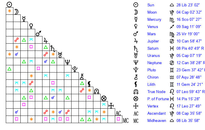 | Sun | 28 Libra 23 | 29 Libra 33 | 28 Aquarius 55 |