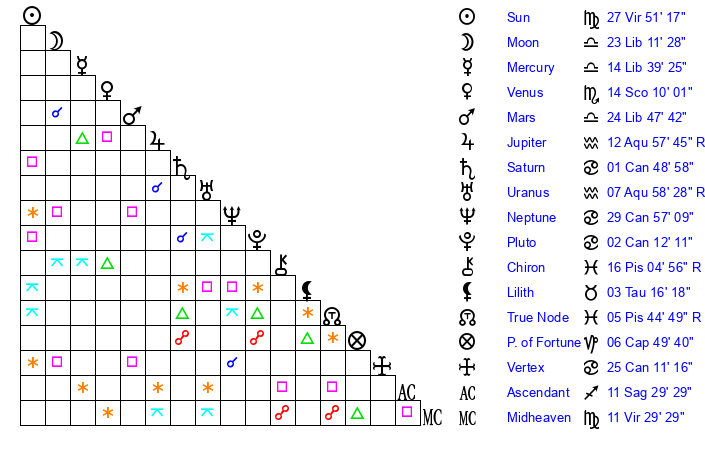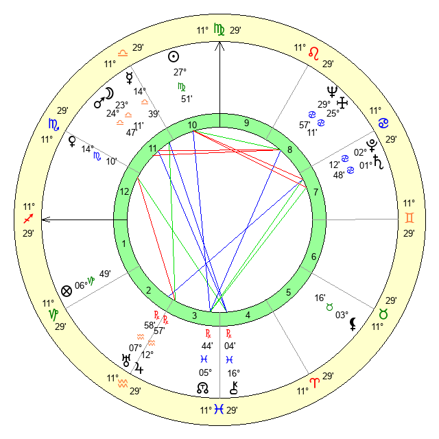 | Moon | 23 Libra 4 | 27 Virgo 27 | 13 Scorpio 34 |