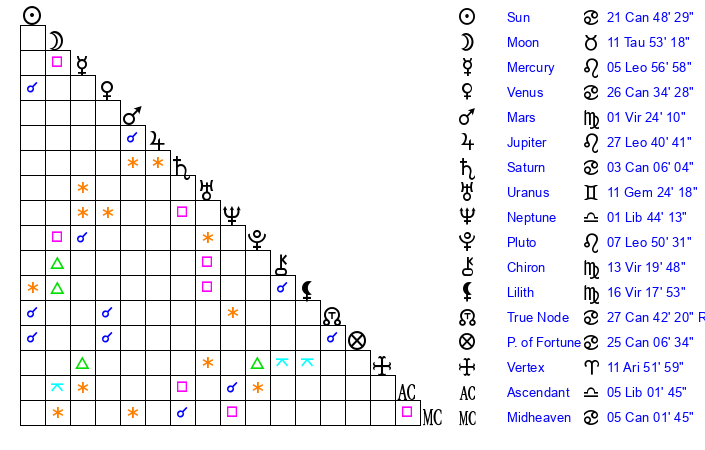 | Venus | 26 Cancer 35 | 10 Gemini 53 | 6 Scorpio 21 |