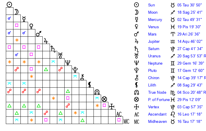 | Uranus | 20 Sagittarius 51 | 26 Taurus 6 | 17 Sagittarius 13 |