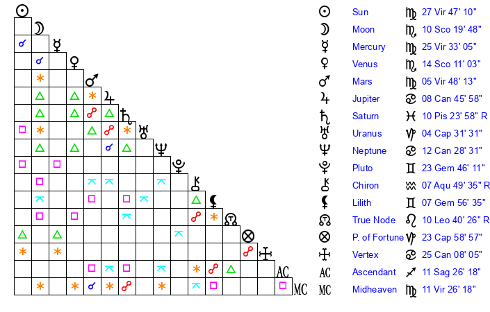 | Moon | 10 Scorpio 13 | 27 Virgo 27 | 26 Pisces 19 |