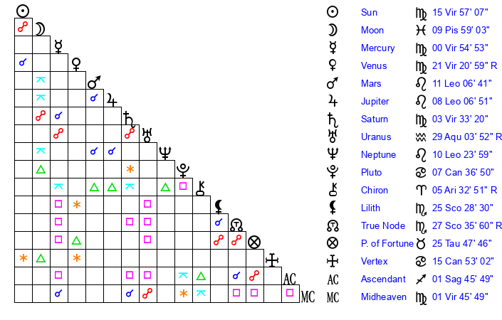 | Saturn | 4 Virgo 12 | 29 Pisces 16 | 12 Virgo 24 |