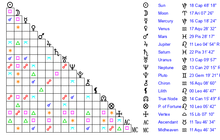 | Saturn | 22 Pisces 59 | 26 Pisces 41 | 6 Aries 13 |