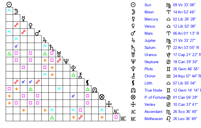 | Sun | 9 Virgo 33 | 10 Virgo 28 | 5 Capricorn 20 |